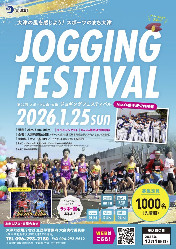 ホーム > 新着情報 > 第27回スポーツの森・大津ジョギングフェスティバル開催! イベント 第27回スポーツの森・大津ジョギングフェスティバル開催! 2025.11.18 第27回スポーツの森・大津ジョギングフェスティバルが2026年1月25日に大津町運動公園で開催されます!スペシャルゲストとしてHonda熊本硬式野球部の皆様が来られます!またグランパワーヒノクニも応援に駆けつけます! 2km、5km、10kmのコースで参加者募集中です!申し込み締め切りは2025年12月1日となっておりますのでお早めにお申し込みください! たくさんのご参加お待ちしております! 前の記事へ 記事一覧へ戻る 最新記事 2025.11.18第27回スポーツの森・大津ジョギングフェスティバル開催! 2025.11.17第33回クラブおおづキッズサッカーフェスティバルを開催しました! 2025.11.11クラブおおづ学童軟式野球チーム 新規メンバー募集! 2025.11.1011/24(月) 勤労感謝の日 振替休日に関して 2025.11.06誰でもできるスローエアロビック教室開催しました! カテゴリー すべて(29) お知らせ(11) イベント(6) サークル(2) ボウリング(2) ジュニアスクール(2) スポーツ教室(9) アーカイブ 月を選択 2025年11月 (5) 2025年10月 (8) 2025年9月 (7) 2025年8月 (4) 2025年7月 (1) 2025年5月 (1) 2025年3月 (1) 2024年11月 (1) 2024年8月 (1)