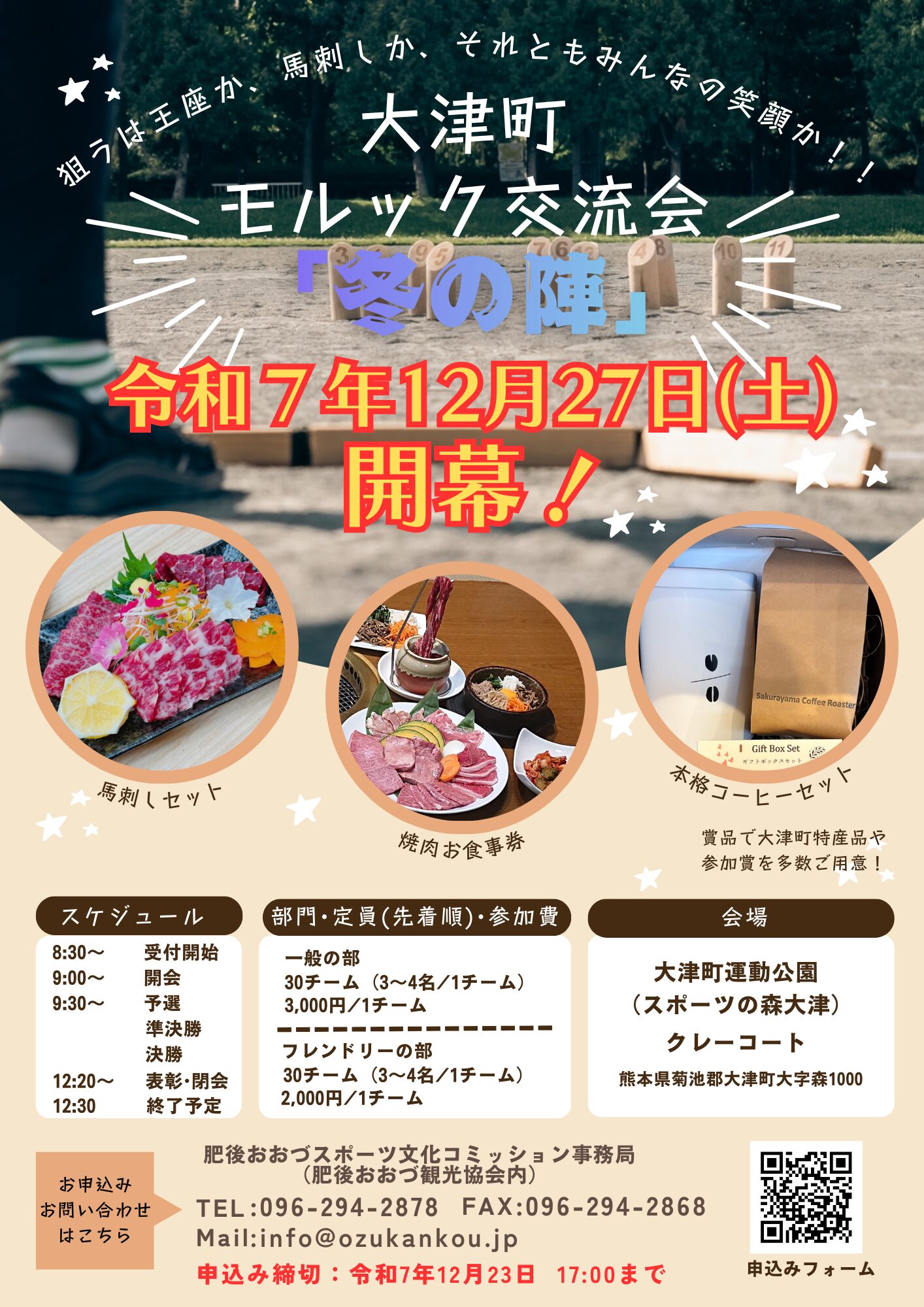 ホーム > 新着情報 > 大津町モルック交流会「冬の陣」開催! イベント 大津町モルック交流会「冬の陣」開催! 2025.12.08 令和7年12月27日土曜日に大津町モルック交流会「冬の陣」を開催します! 一般の部とフレンドリーの部があるので、チャレンジしたい方から、気軽に参加したい方まで幅広くご参加いただけます! ご家族やお友達などとお申し込みください! それぞれの部門に賞品があり、大津町の特産品や道の駅大津で利用できる商品券などをご用意しております! 2025年締めくくりの思い出作りにぜひご参加ください! たくさんのご参加お待ちしております! 前の記事へ 記事一覧へ戻る 最新記事 2025.12.08大津町モルック交流会「冬の陣」開催! 2025.12.052026年度新U13〜15選手体験会及び保護者説明会開催! 2025.12.02第51回 熊日学童オリンピック出場(クラブおおづ陸上) 2025.11.18第27回スポーツの森・大津ジョギングフェスティバル開催! 2025.11.17第33回クラブおおづキッズサッカーフェスティバルを開催しました! カテゴリー すべて(32) お知らせ(11) イベント(7) サークル(2) ボウリング(2) ジュニアスクール(4) スポーツ教室(9) アーカイブ 月を選択 2025年12月 (3) 2025年11月 (5) 2025年10月 (8) 2025年9月 (7) 2025年8月 (4) 2025年7月 (1) 2025年5月 (1) 2025年3月 (1) 2024年11月 (1) 2024年8月 (1)