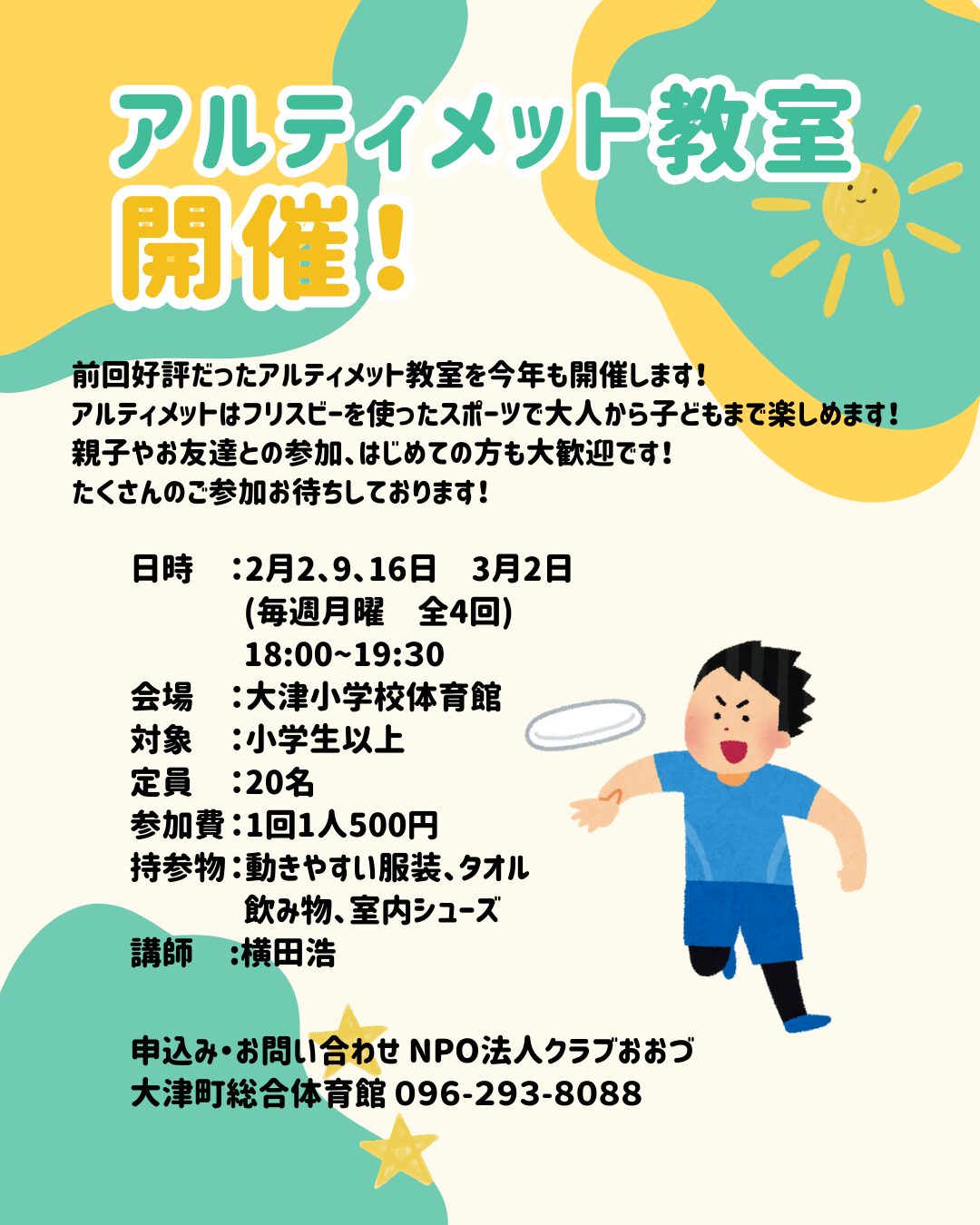 ホーム > 新着情報 > アルティメット教室開催します! スポーツ教室 アルティメット教室開催します! 2026.01.16 前回好評だったアルティメット教室を開催します!アルティメットとはフリスビーを使ったスポーツで子どもから大人まで楽しめます!親子やお友達、初心者のご参加大歓迎です! 今回も前回に引き続き、講師に2024年世界マスターズアルティメット選手権日本代表の横田浩さんをお呼びしています! たくさんのご参加お待ちしております! 前の記事へ 記事一覧へ戻る 次の記事へ 最新記事 2026.01.23総選挙に伴う大津町総合体育館の利用に関して 2026.01.19第2回 2026年度新U13〜15選手体験会及び保護者説明会開催! 2026.01.16アルティメット教室開催します! 2026.01.14大津町モルック交流会「冬の陣」開催しました! 2026.01.132月以降大津町総合体育館施設利用について カテゴリー すべて(43) お知らせ(18) イベント(9) サークル(4) ボウリング(3) ジュニアスクール(6) スポーツ教室(11) アーカイブ 月を選択 2026年1月 (6) 2025年12月 (8) 2025年11月 (5) 2025年10月 (8) 2025年9月 (7) 2025年8月 (4) 2025年7月 (1) 2025年5月 (1) 2025年3月 (1) 2024年11月 (1) 2024年8月 (1)