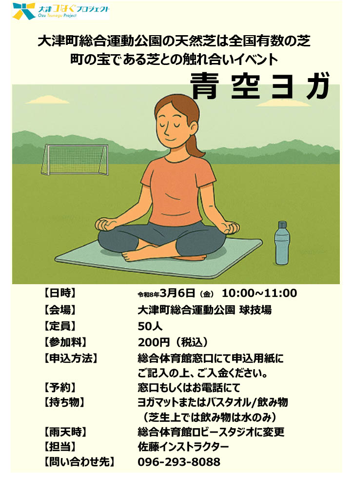 大津町総合運動公園の天然芝は全国有数の芝ということはご存じでしょうか。町の宝でもある芝と触れ合う屋外イベントを開催いたします。春先のこの季節に自然を感じませんか?多くのご参加お待ちしております。