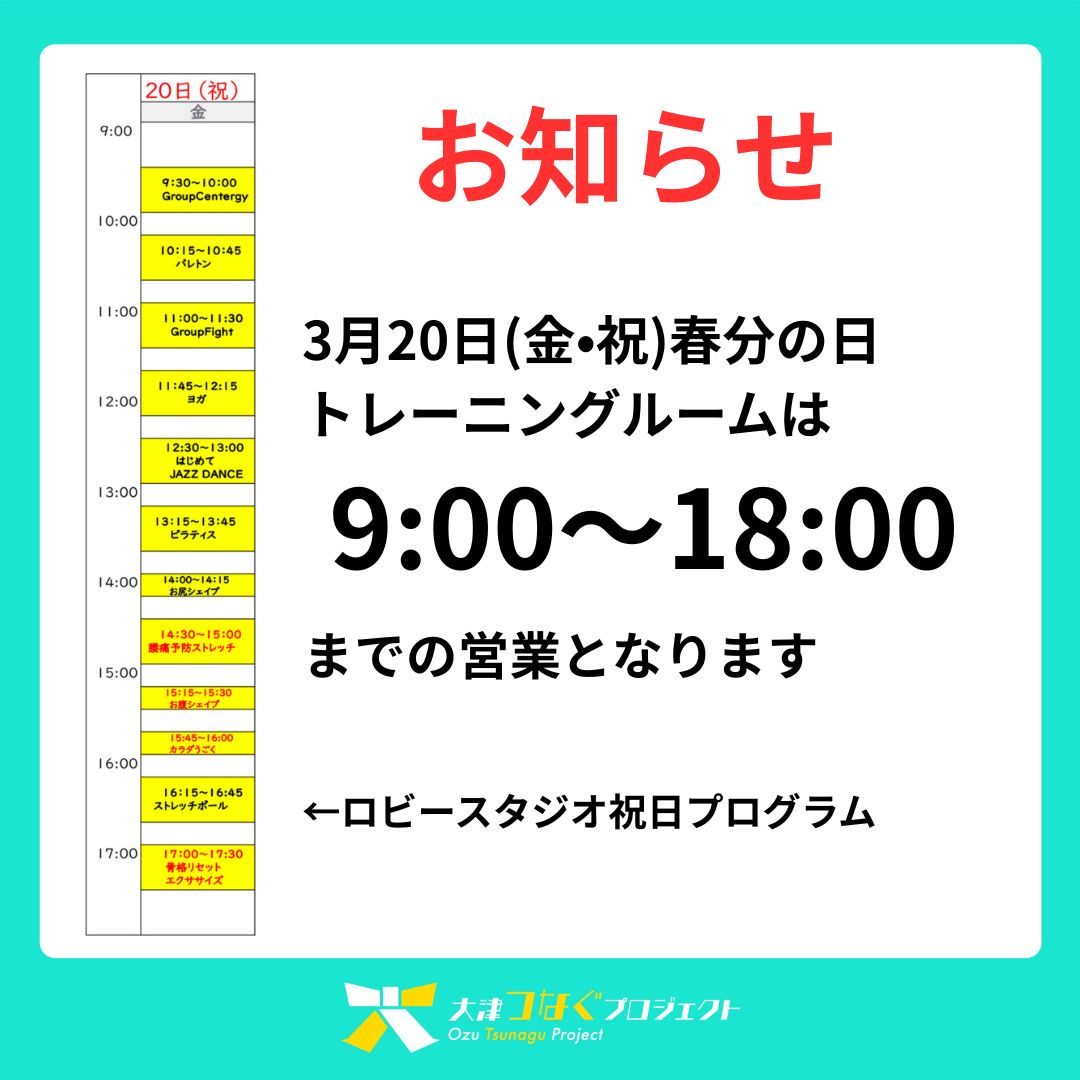 ホーム > 新着情報 > 3/20(金・祝)春分の日 営業時間のお知らせ お知らせ 3/20(金・祝)春分の日 営業時間のお知らせ 2026.03.12 大津町総合体育館トレーニングルームからのお知らせです。 3月20日(金・祝)春分の日のトレーニングルーム営業時間は9:00〜18:00までとなります。ロビースタジオも祝日プログラムとなります。 ご利用お待ちしております。 #熊本県#大津町#クラブおおづ#大津つなぐプロジェクト#春分の日 前の記事へ 記事一覧へ戻る 次の記事へ 最新記事 2026.03.12令和8年度 第1回平日エンジョイ卓球大会日程変更のお知らせ 2026.03.123/20(金・祝)春分の日 営業時間のお知らせ 2026.03.11ジュニアサッカー 2026年度 新規入会募集中! 2026.03.05令和8年度 第1回平日エンジョイ卓球を開催します 2026.02.25青空ヨガ開催! カテゴリー すべて(55) お知らせ(25) イベント(14) サークル(6) ボウリング(3) ジュニアスクール(7) スポーツ教室(12) アーカイブ 月を選択 2026年3月 (4) 2026年2月 (4) 2026年1月 (10) 2025年12月 (8) 2025年11月 (5) 2025年10月 (8) 2025年9月 (7) 2025年8月 (4) 2025年7月 (1) 2025年5月 (1) 2025年3月 (1) 2024年11月 (1) 2024年8月 (1)